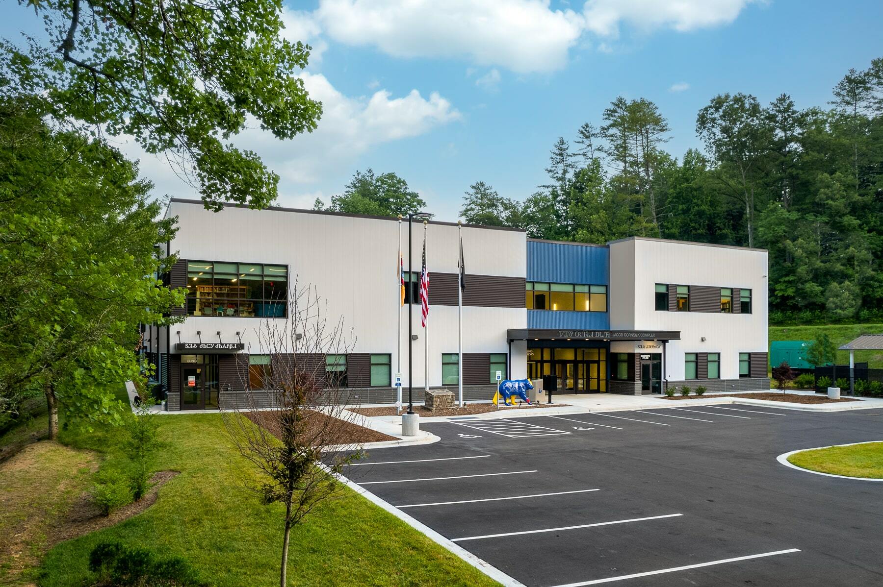 The Eastern Band of Cherokee Indians’ Jacob Cornsilk Complex Community Building is located in rural Snowbird, NC near Robbinsville. This new construction project nestled on the side of a mountain and along a native trout stream created several logistical challenges. The building was named after a WWII POW (Jacob Cornsilk) and elements of that memorial are part of the new design today, along with some of the original tongue and groove wood ceiling that has been reclaimed and used in the new design. The project is constructed of a 47,545 SF, steel frame, concrete slab on joist, and metal decking. The 2-story facility houses several key community programs which are vital to the Eastern Band of Cherokee Indians in the Snowbird Community including the following; gymnasium with complete locker rooms, fitness center, clinic space, dental clinic, police station, transit department, library, and office administration staff.